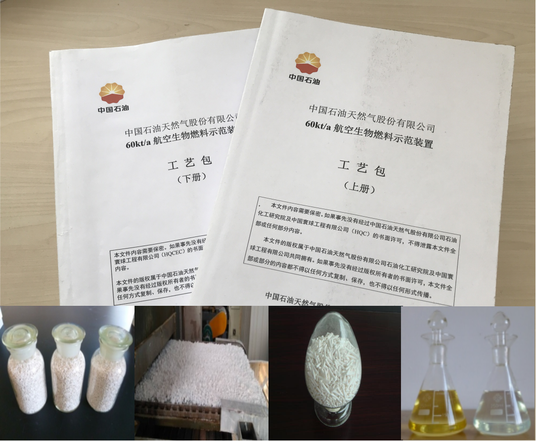 主要技术创新:(1)开发出“转化-络合-吸附”毛油精炼工艺,高效脱除毛油中微量杂质,精炼油收率达到96.4%;(2)研制了高水热稳定性的油脂加氢脱氧催化剂,居同行业领先水平;(3)开发了表面酸性调控的选择性裂化异构催化剂,航煤收率达到63.5%;(4)编制了包含原料精炼、加氢脱氧和裂化异构全流程的6万吨/年航空生物燃料工艺包;(5)提出了涵盖小桐籽油、棕榈酸化油、餐厨废弃油脂、蓖麻籽油等多种原料的原料供应方案;(6)构建了中国石油首个航空生物燃料全生命周期分析模型和基础数据库,完成了碳排放全生命周期分析。