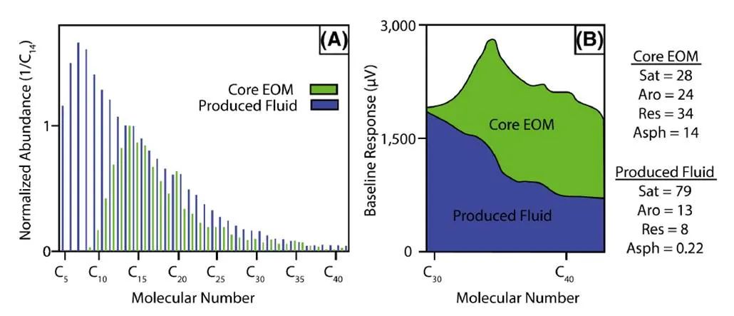 应用该技术分析墨西哥湾沿岸白垩纪页岩,含油孔隙中约30%为重油,约70%为轻质油;西加拿大沉积盆地中生代页岩高成熟井的孔隙流体由轻质油和天然气(80%)构成,20%的不可萃取有机质是可转换的,低成熟井的孔隙流体由38%的轻质油和气体构成,剩余52%是可转化的。有效指导了页岩油井的勘探开发方案设计。