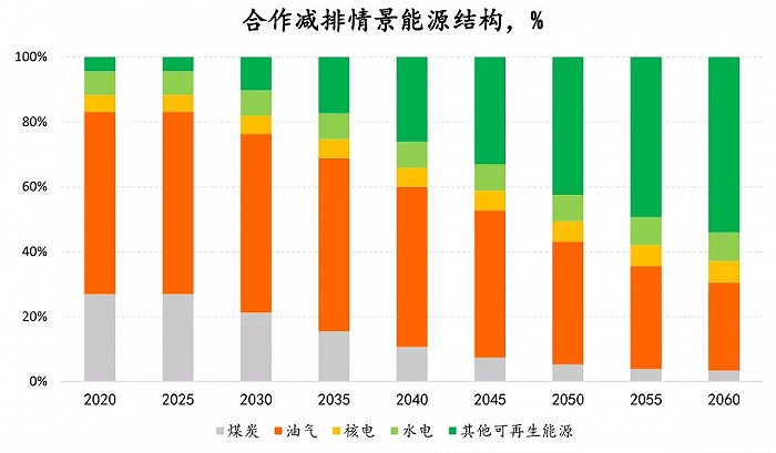 对于2040年后的变化,报告认为,如果全球各国能够加大沟通协调,实施有力的合作减排,那么在这一情景下,2040年后油气占比将走向下降,到2060年降至23%(油气各占10%和13%)。