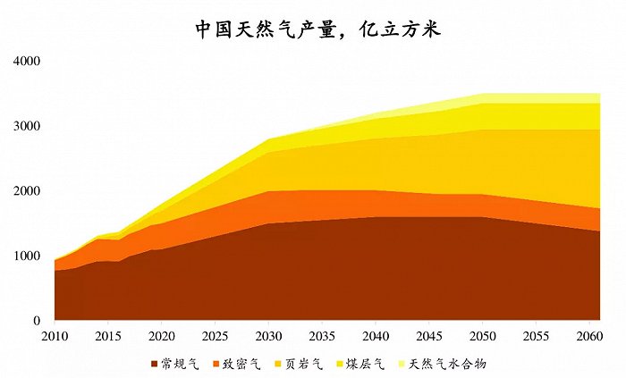 2035年前中国原油产量约2亿吨左右。天然气产量较快增长,预计2030年突破2500亿立方米,2060年近3500亿立方米。