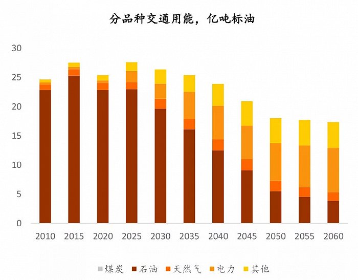 2060年,交通部门电气化率43.9%,比2015年提高42.6个百分点;氢等占比从2.5%上升到25.3%;而石油从91.9%下降到22.1%。